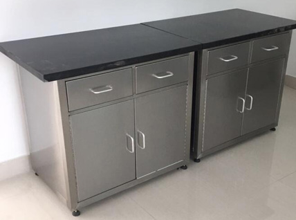 不銹鋼臺面:采用S304不銹鋼四邊折彎內(nèi)襯18-25MM夾板制作(刨花板、中纖板、實芯理化板、環(huán)氧樹脂板、千思板、陶瓷板等臺面,根據(jù)客戶需求提供);